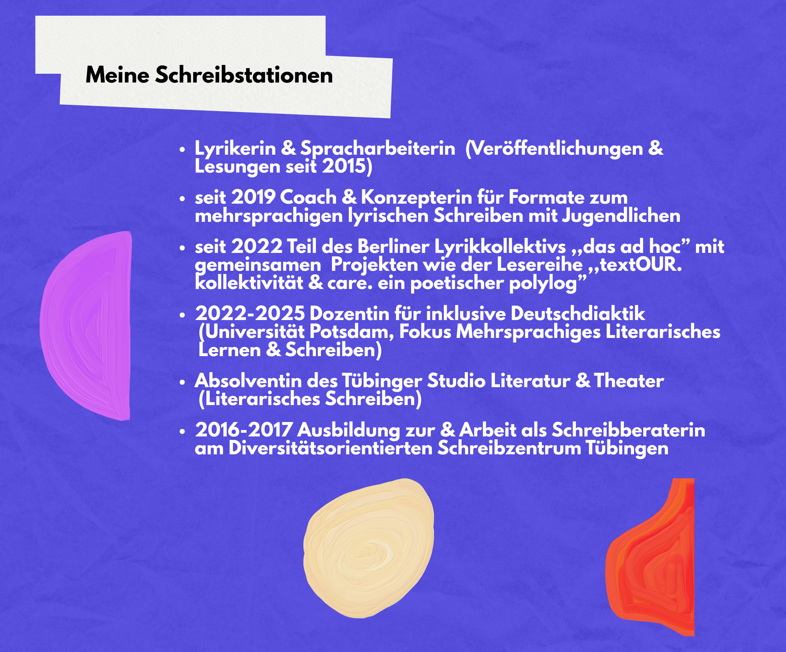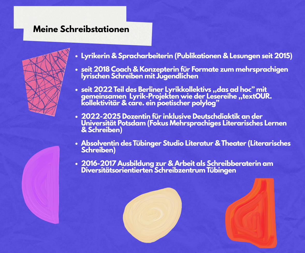 Sie möchten Jugendliche befähigen, was sie bewegt, lyrisch in eigene Worte zu fassen? Sie möchten mehrsprachige Schreibräume gestalten? Ich unterstütze Sie mit Schreibimpulsen in meinen Workshops zum Mehrsprachigen Lyrischen Schreiben.
